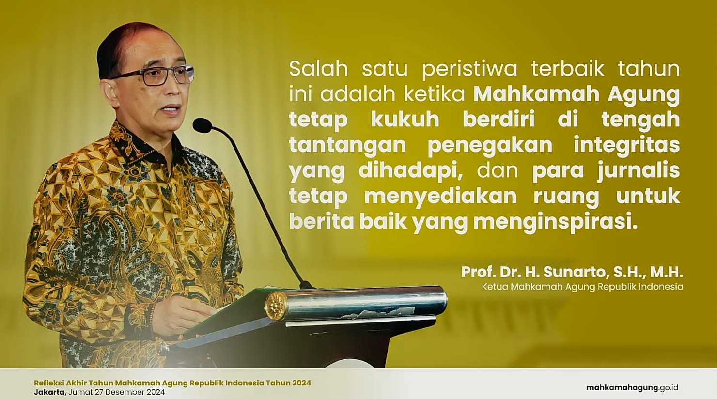 Dalam Kesempatan ini Yangmulia Ketua Mahkamah Agung RI juga menyampaikan "Salah satu peristiwa terbaik tahun ini adalah ketika Mahkamah Agung tetap kukuh berdiri di tengah tantangan penegakan integritas yang dihadapi, dan para jurnalis tetap menyediakan ruang untuk berita baik yang menginspirasi"