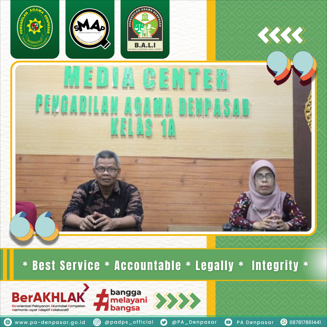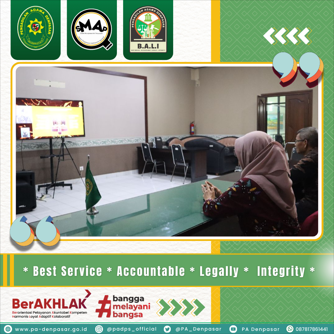 Denpasar, 27 Desember 2024 - Bapak Muhamad Shalahudin Hamdayani, S.H., M.A. Ketua PA Denpasar dan Ibu Hj. Mahmudah Hayati, S.Ag., M.H.I. Wakil Ketua PA Denpasar mengikuti acara Refleksi Kinerja Mahkamah Agung Tahun 2024 melalui Kanal Youtube Mahkamah Agung di Ruang Media Centre PA Denpasar.