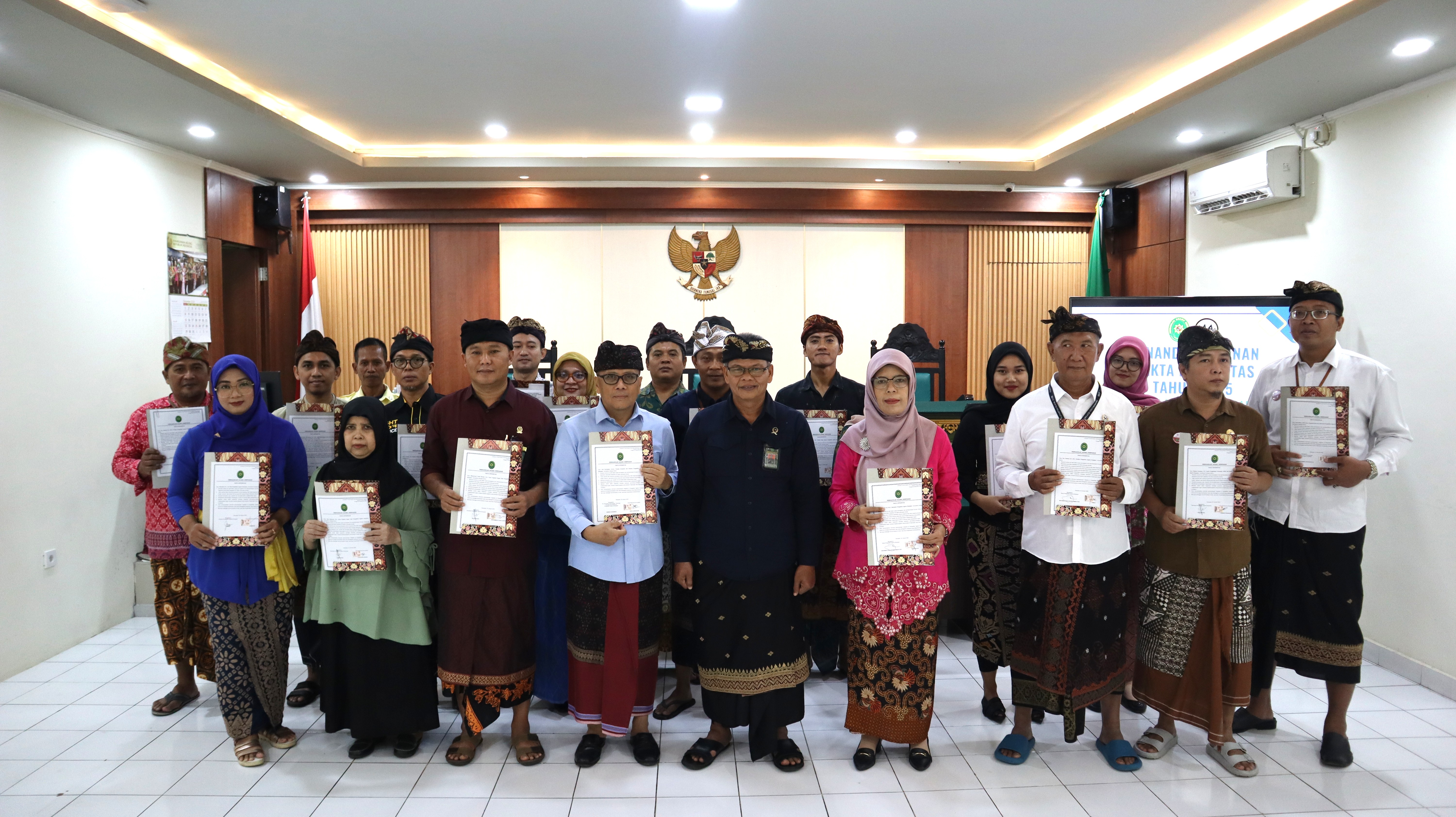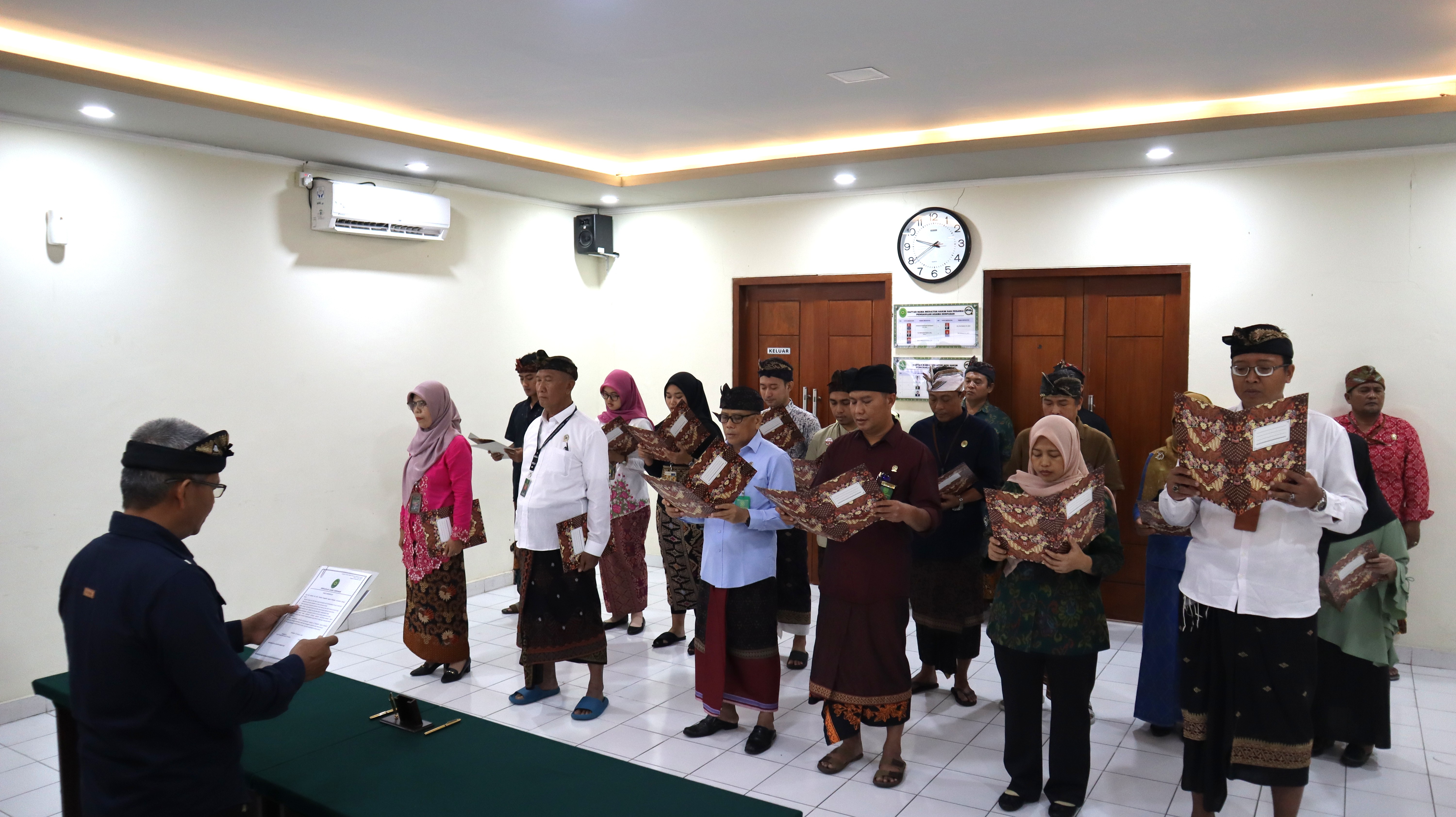 Denpasar, 2 Januari 2025 - Mengawali tahun 2025 Pengadilan Agama Denpasar melaksanakan penandatanganan pakta integritas di Ruang Sidang Kantor PA Denpasar. Penandatanganan tersebut diikuti oleh Seluruh Pegawai PA Denpasar mulai dari unsur Pimpinan yaitu Ketua, Wakil Ketua, Sekretaris, dan Panitera serta Hakim, Panitera Muda, Kepala Sub Bagian, Panitera Pengganti, Jurusita, Jurusita Pengganti, Staf Kepaniteraan dan Staf Kesekretariatan. Bapak Muhamad Shalahudin Hamdayani, S.H., M.A. Ketua PA Denpasar, memimpin dalam pelaksanaan penandatanganan Pakta Integritas seluruh Hakim dan Pegawai Pengadilan Agama Denpasar