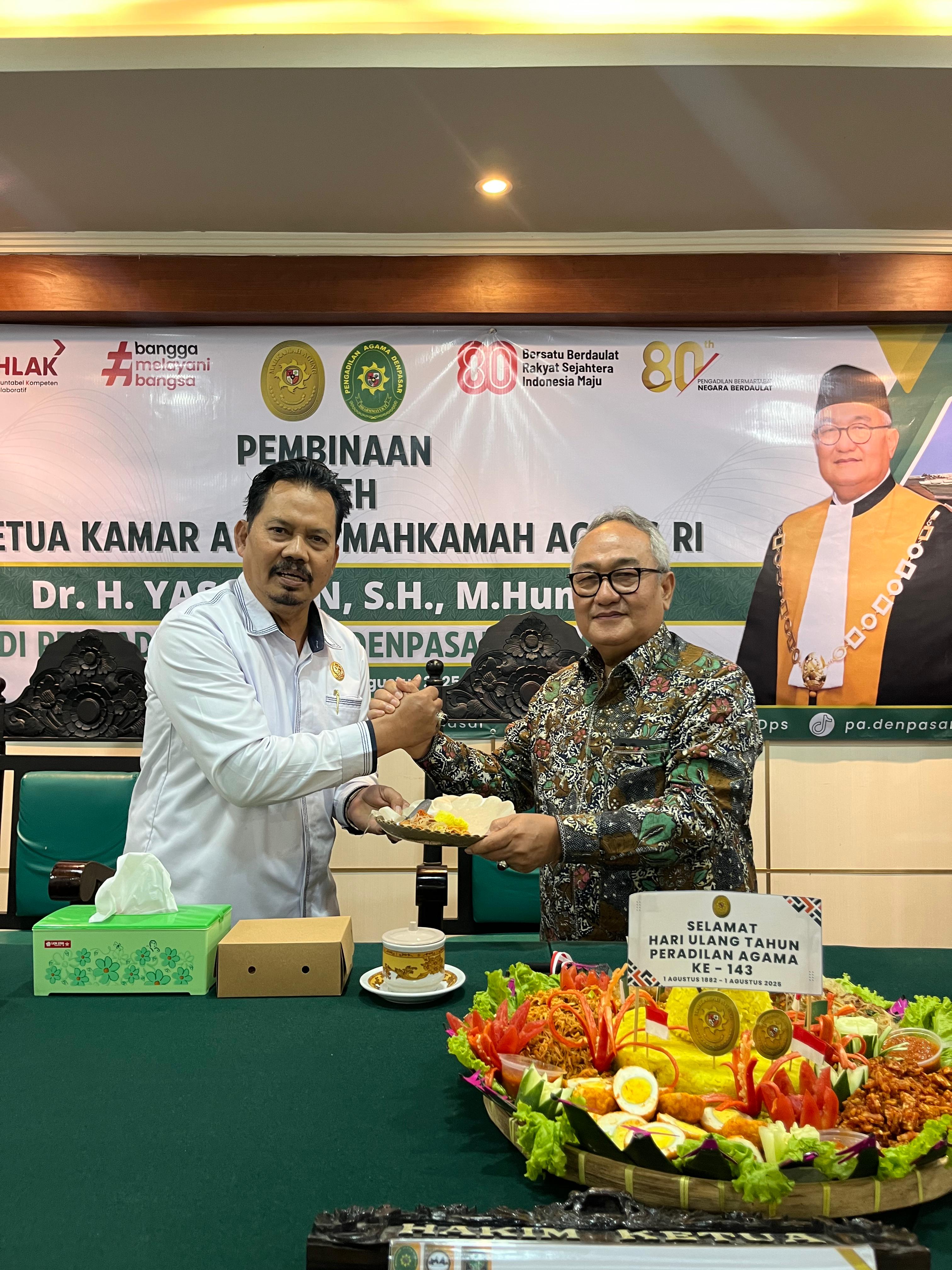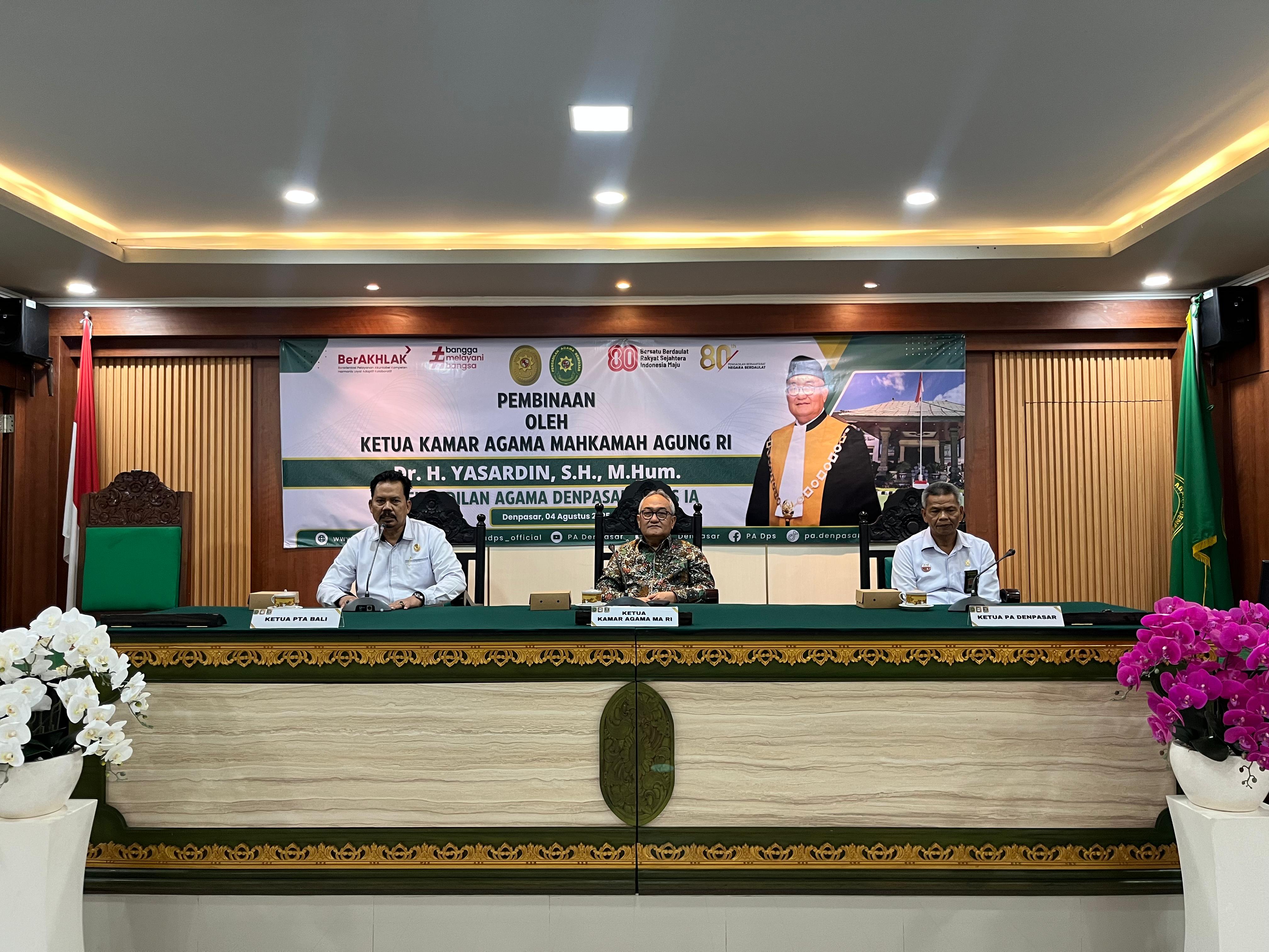 Denpasar, 04 Agustus 2025 - Bertempat di Ruang Sidang Utama Pengadilan Agama Denpasar, dilaksanakan kegiatan Pembinaan oleh YM. Ketua Muda Kamar Agama Mahkamah Agung RI, Dr. H. Yasardin, S.H., M.Hum. Acara yang dimulai pada pukul 08.15 ini, dihadiri oleh Ketua PTA Bali, Wakil Ketua PTA Bali, Hakim Tinggi PTA Bali, serta Ketua, Wakil Ketua, Panitera, dan Sekretaris Pengadilan Agama se-wilayah hukum Pengadilan Tinggi Agama Bali.