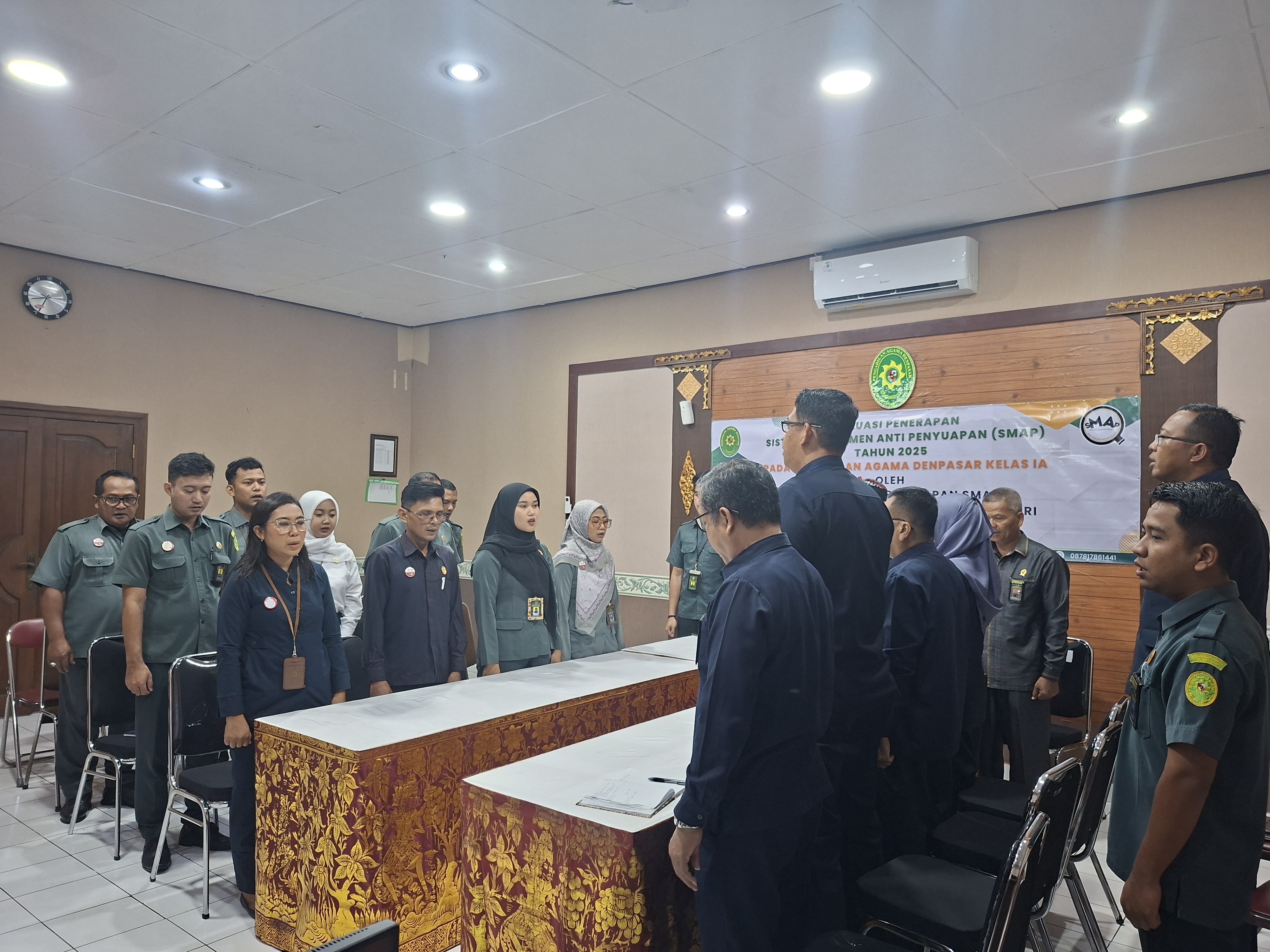 Denpasar, 22-23 Oktober 2025 - Tim Evaluator Penerapan Sistem Manajemen Anti Penyuapan (SMAP) Badan Pengawasan Mahkamah Agung RI berkunjung ke Pengadilan Agama Denpasar untuk melakukan Penilaian terhadap penerapan Sistem Manajemen Anti Penyuapan (SMAP) pada Pengadilan Agama Denpasar dalam tahap Pembangunan. Sesuai dengan surat tugas Kepala Badan Pengawasan MA RI Nomor 720/BP/ST.PW.1.1.1/X/2025, penilaian SMAP (Uji petik dan wawancara) dari tanggal 21 s.d. 24 Oktober 2025.
