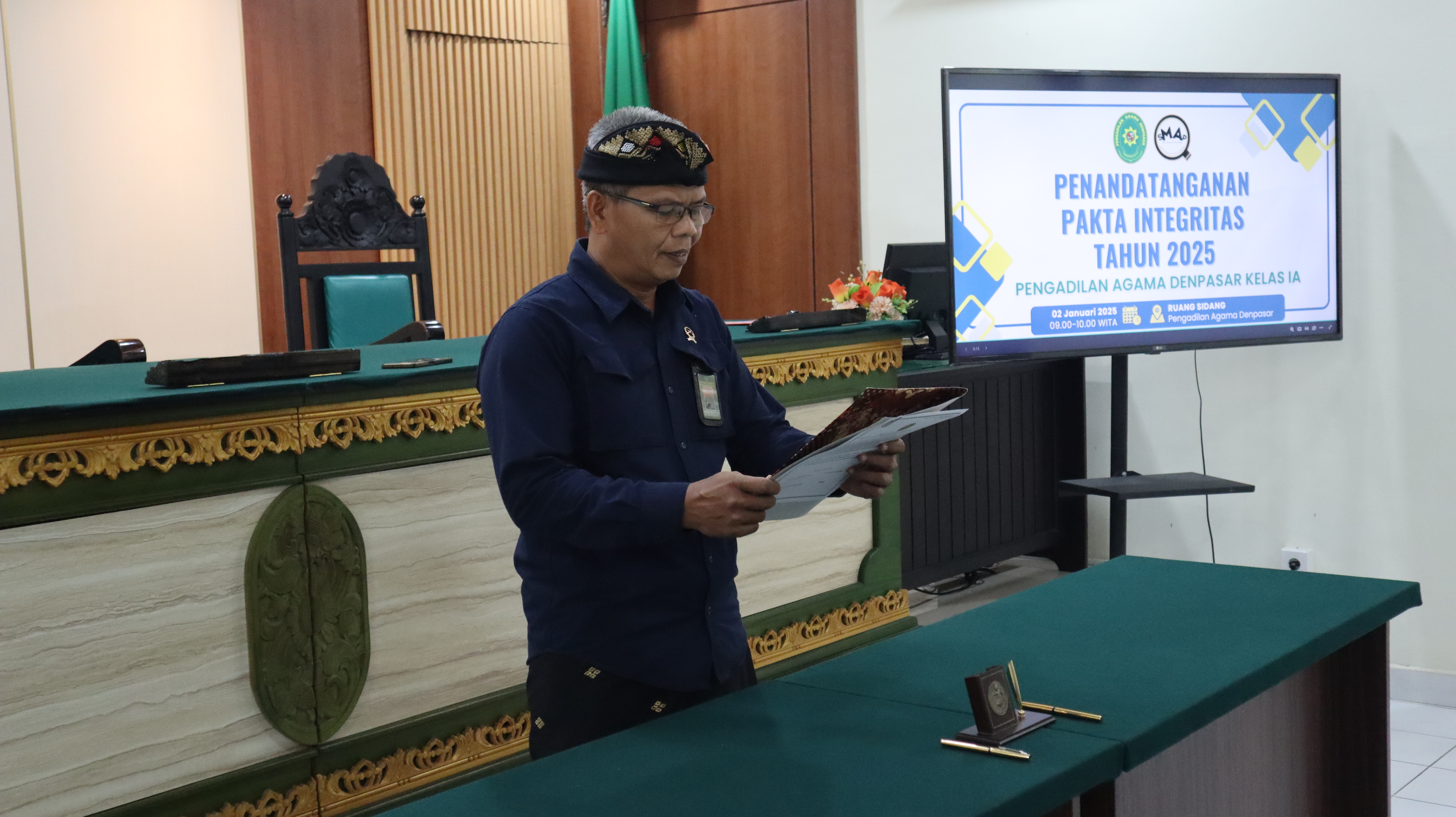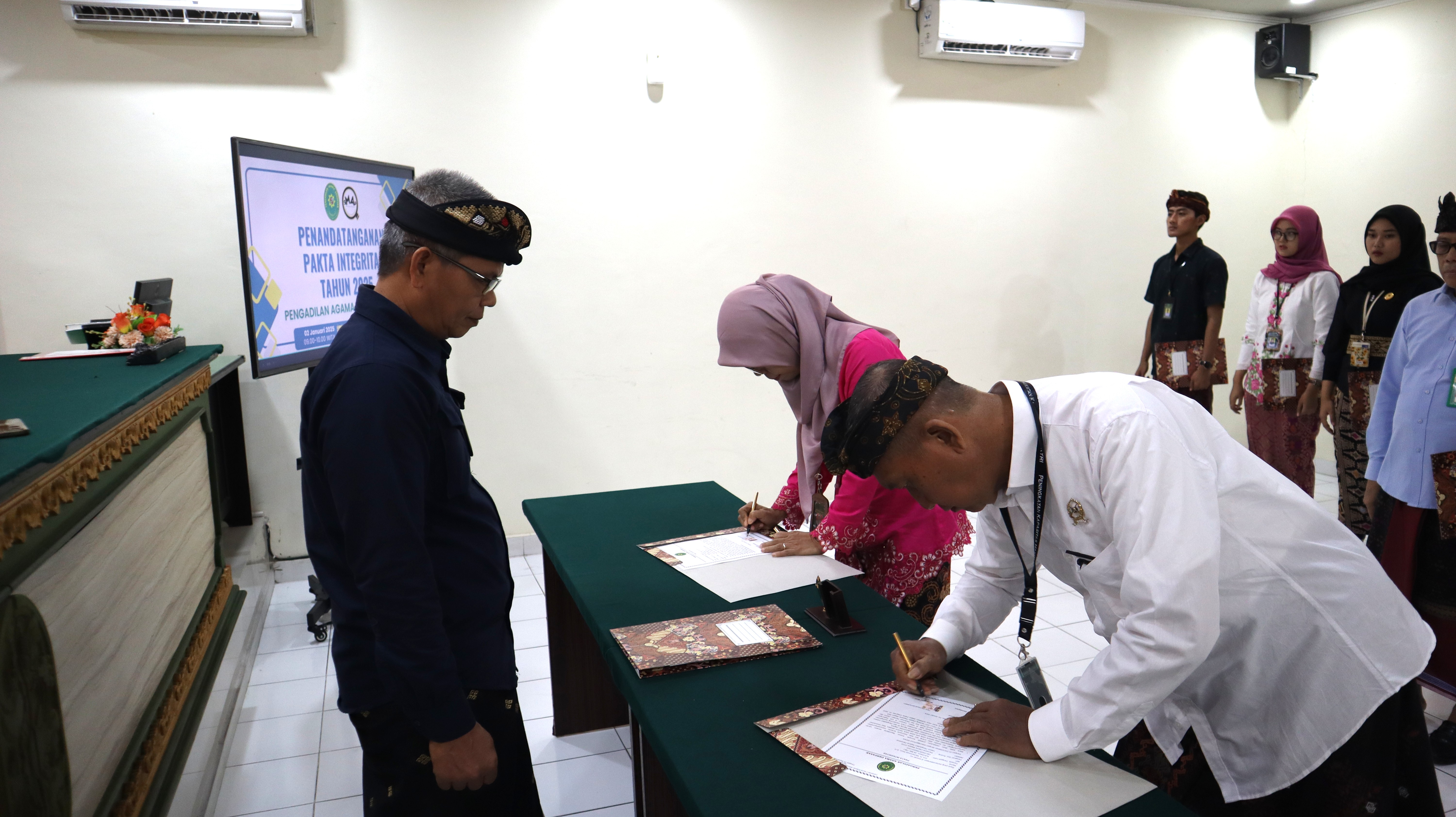Denpasar, 2 Januari 2025 - Mengawali tahun 2025 Pengadilan Agama Denpasar melaksanakan penandatanganan pakta integritas di Ruang Sidang Kantor PA Denpasar. Penandatanganan tersebut diikuti oleh Seluruh Pegawai PA Denpasar mulai dari unsur Pimpinan yaitu Ketua, Wakil Ketua, Sekretaris, dan Panitera serta Hakim, Panitera Muda, Kepala Sub Bagian, Panitera Pengganti, Jurusita, Jurusita Pengganti, Staf Kepaniteraan dan Staf Kesekretariatan. Bapak Muhamad Shalahudin Hamdayani, S.H., M.A. Ketua PA Denpasar, memimpin dalam pelaksanaan penandatanganan Pakta Integritas seluruh Hakim dan Pegawai Pengadilan Agama Denpasar