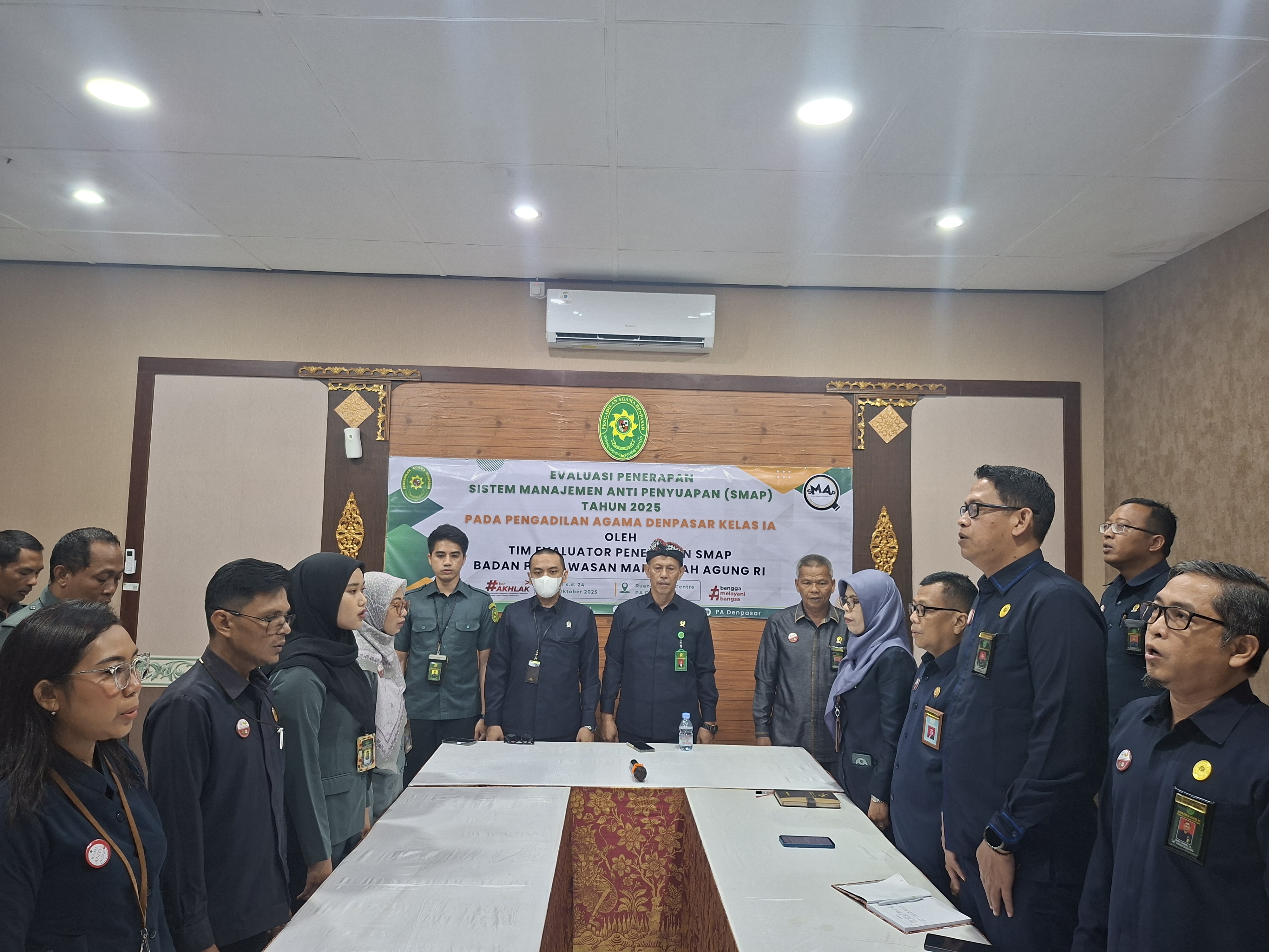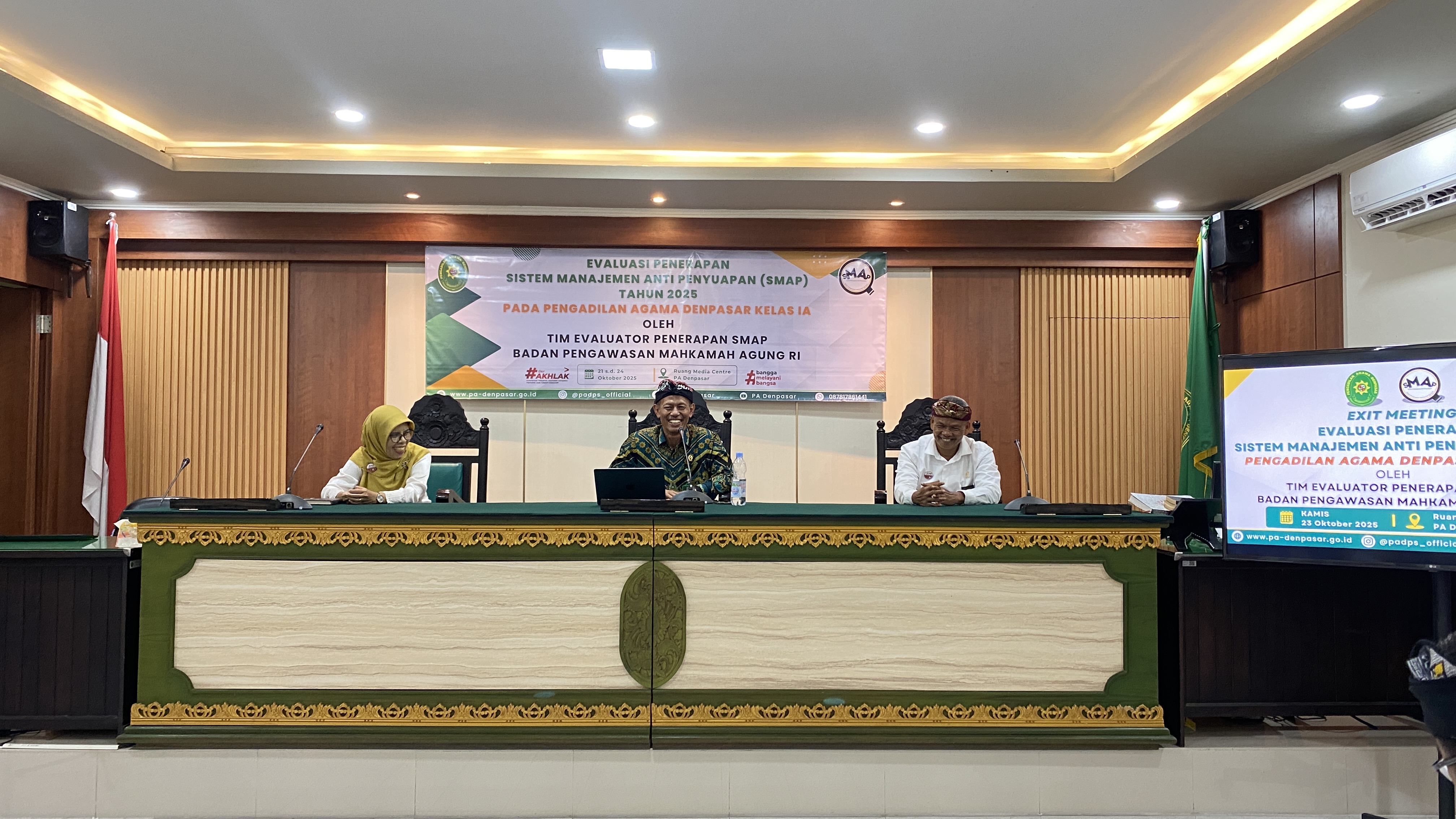 Denpasar, 22-23 Oktober 2025 - Tim Evaluator Penerapan Sistem Manajemen Anti Penyuapan (SMAP) Badan Pengawasan Mahkamah Agung RI berkunjung ke Pengadilan Agama Denpasar untuk melakukan Penilaian terhadap penerapan Sistem Manajemen Anti Penyuapan (SMAP) pada Pengadilan Agama Denpasar dalam tahap Pembangunan. Sesuai dengan surat tugas Kepala Badan Pengawasan MA RI Nomor 720/BP/ST.PW.1.1.1/X/2025, penilaian SMAP (Uji petik dan wawancara) dari tanggal 21 s.d. 24 Oktober 2025.